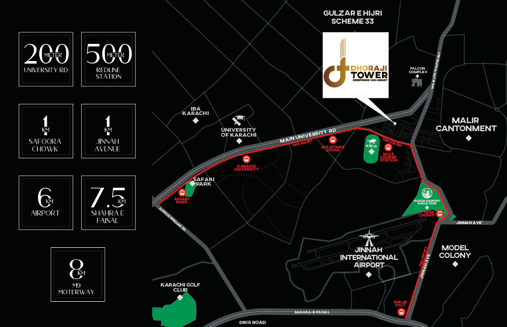 Located near Main University Road in Scheme 33, Dhoraji Tower allows the access to major destinations. Set inside aa gated community, it offers added peace of mind along with easy access to major routes. Just a few steps from Jinnah Avenue and only a short walk from Safoora Chowk, residents benefit from seamless connectivity at all hours.The Red Line Bus service stop is also positioned only a fewsteps away, making daily commutes fast and cost-effective. The project’s surroundings include everything that supports modern family life. A state-of-the-art school is located within the community itself, offering top-tier education without long commutation.